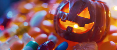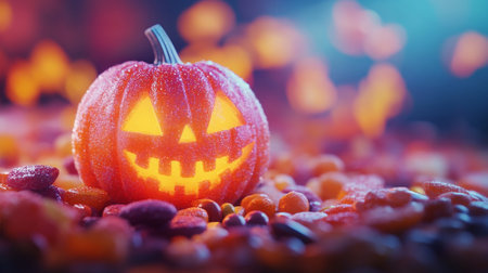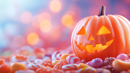Festive halloween pumpkin with glowing smile surrounded by colorful candy in vibrant bokeh background.