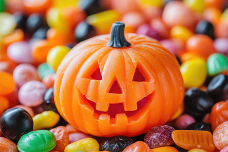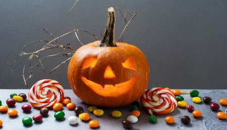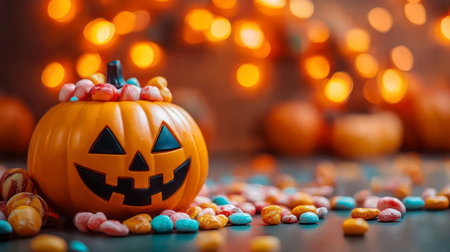A cheerful orange pumpkin sits against a warm background with a carved face. Surrounding it are colorful candies perfect for Halloween celebrations.