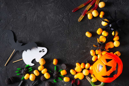 Halloween party concept with candy and funny pumpkin on black background, copy space, top view