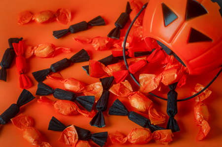 Halloween background - Close up of black and orange candies with pumpkin bag on orange background