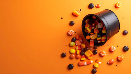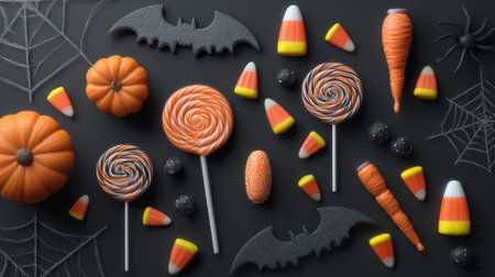 An overhead view displays various Halloween candies and decorative elements. Orange lollipops and candy corn are present, alongside carved pumpkins and bat silhouettes. The dark background enhances the festive atmosphere. This image could be used for holiday-themed advertising, product design, or editorial content.