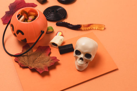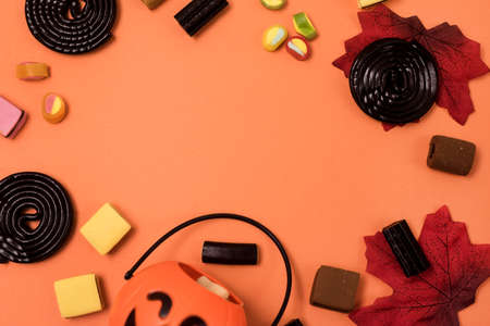 Holiday Background with Fake Autumn Leaves Halloween Candy and Small Jack-O-Lantern Pumpkin Basket with Candy Orange Background Copy Space Top View