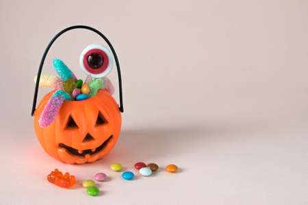Halloween jack pumpkin bucket with candy on texture background. Trick or Treat. Copy space.