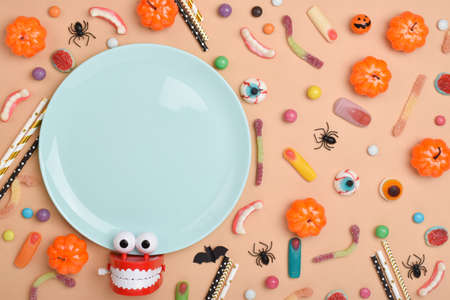 A blue plate on the background of various sweets on an orange background with a place for text. Background for the Halloween holiday. Flat layout, top view, a place to copy.