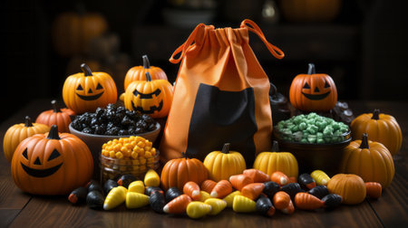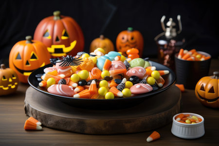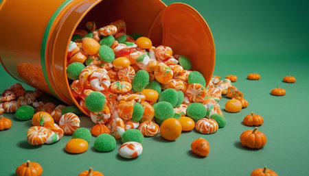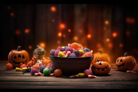 Concept illustration of a bright illustration of candies on a colorful Halloween-style background. Generative AI