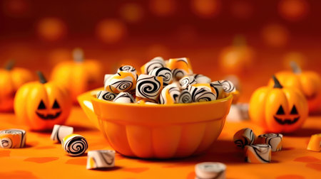 Concept illustration of a Halloween candies with paper decorations on orange background. Generative AI
