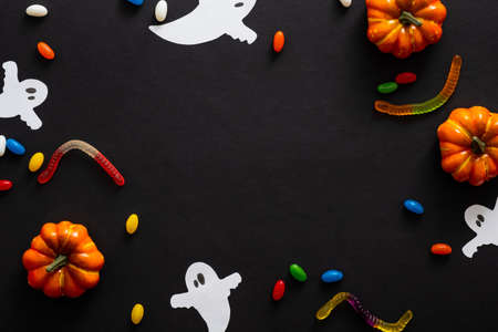 Halloween frame with pumpkins, candy, ghosts isolated on black background. Halloween party invitation card mockup. Flat lay, top view, copy space.