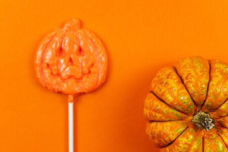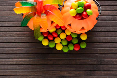 Halloween candies in the shape of a pumpkin, candies in the form of dragee and sweets in the background.