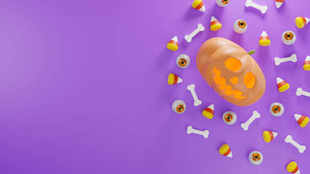 Halloween's day concept. Cute pumpkin ghost, bone and eyeball, celebration Halloween event template minimal style on purple background, 3D rendering