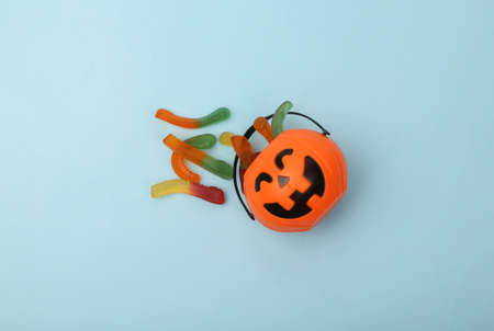 Halloween candy bucket with jelly worms on a blue background. Trick or Treat
