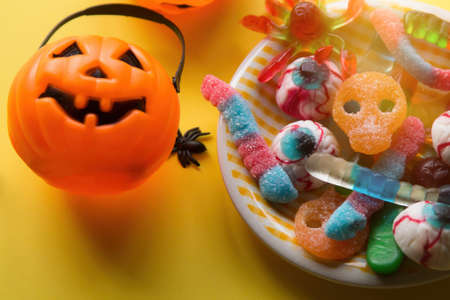 Halloween Background Halloween Sweets and Candy Small Jack-O-Lantern Pumpkin Basket with Candy Yellow Background Horizontal Top View