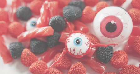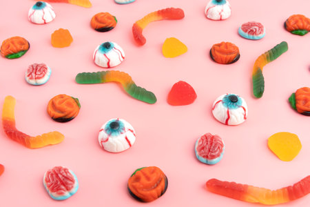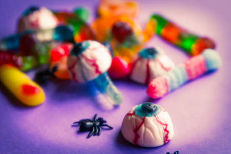 Displaying Halloween candies on white surface, pink and blue eyeballs, red licorice, beaded gummies. Orb, sweets, display, tabletop, macro, confectionery, spooky