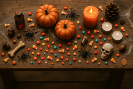 A table adorned with pumpkins, candy corn, spiders, and candles for halloween decoration