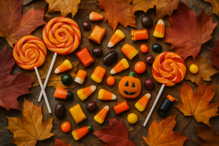 A variety of halloween candies displayed on vibrant autumn leaves, creating a festive mood