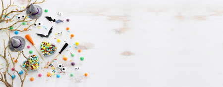 top view image of Halloween holoday. witcher hat, broom, bare trees, treats and bats over white wooden table