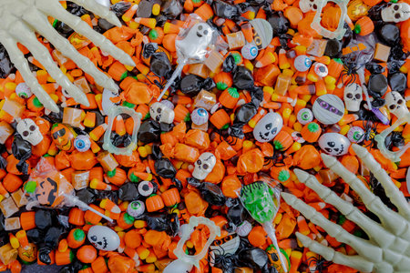 Variety of Halloween candy spilled on black stone surface with skeleton hands grabbing candy