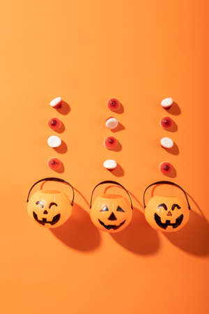 Halloween candies and three pumpkin shaped buckets against orange background. halloween festivity and celebration concept