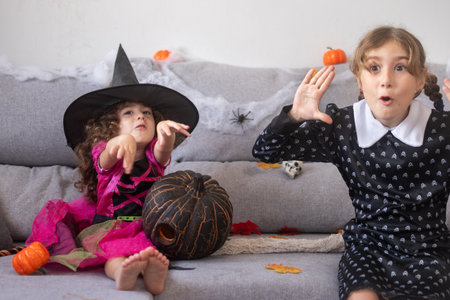 Cute little girls in halloween costumes having fun at home