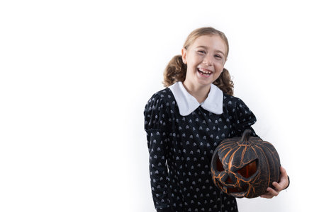 Smiling girl in Halloween costume holding a Halloween pumpkin isolated on white background. Copy space