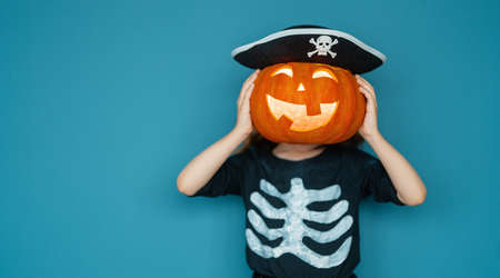 Happy Halloween! Cute little laughing girl in pirate costume on blue wall background.