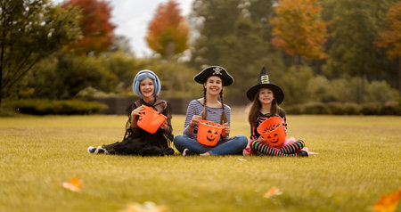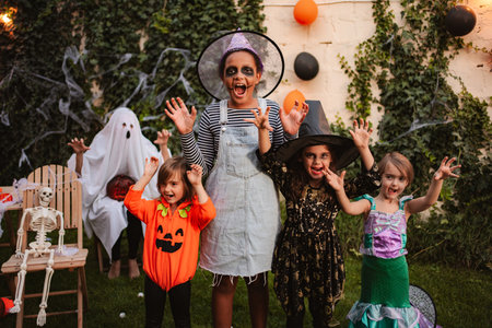 Children celebrating Halloween wearing costumes in a garden