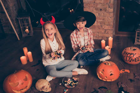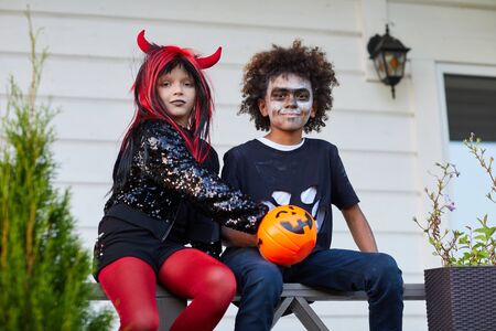 Portrait of two happy kids eating Halloween candy outdoors after trick or treating together