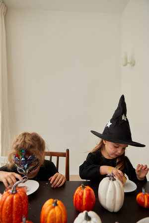 two diverse kids girl in costume of witch, having fun in kitchen, eating cookies, celebrating Halloween.
