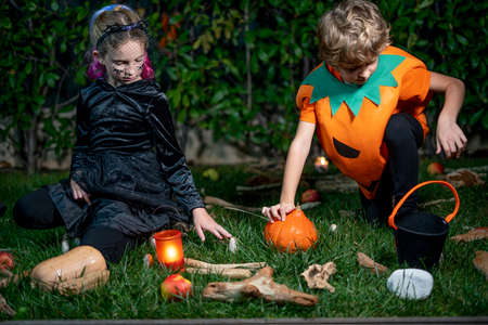 Little girl and boy in witch costume on Halloween trick or treat in the night garden. Children celebrate Halloween at decorated fireplace. Family trick or treating. Concept of children ready for a party.