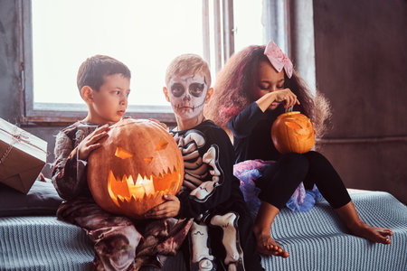 Group of multiracial kids during Halloween party holds pumpkins while sitting on bed in an old house.