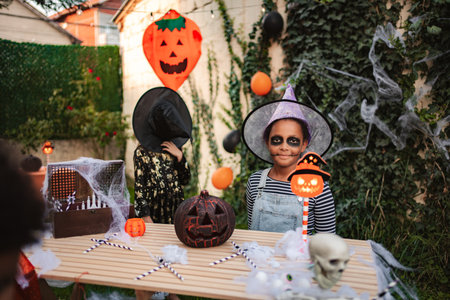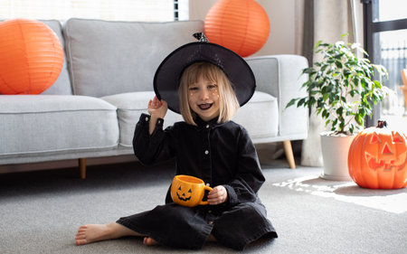 Joyful children in witch costumes celebrate halloween surrounded by pumpkin decorations indoors