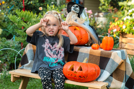 Little girl is getting ready for Halloween, decorating the garden with pumpkins and a skeleton