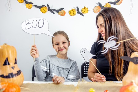 Halloween fun. A mother and daughter posing with Halloween decorations and costumes.