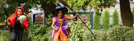 cheerful african american kids in halloween costumes holding brooms outside, banner