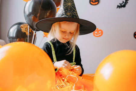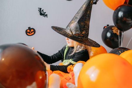 Childrens Halloween - a girl in a witch hat and a carnival costume with airy orange and black balloons at home. Ready to celebrate Halloween