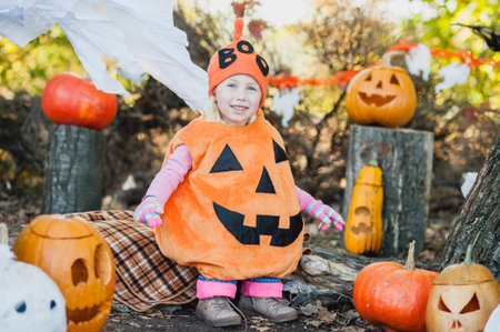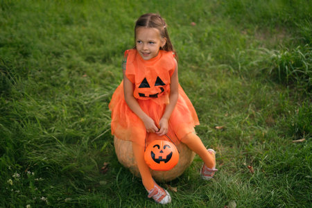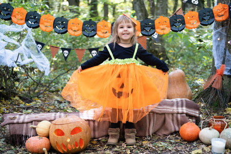 Halloween. cute little girl in pumpkin costume having fun, celebrating Halloween outdoor