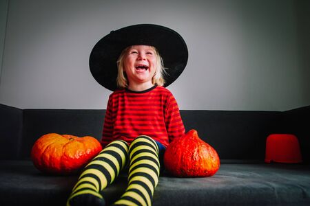 cute little girl with pumpkins have fun, kid celebrating halloween