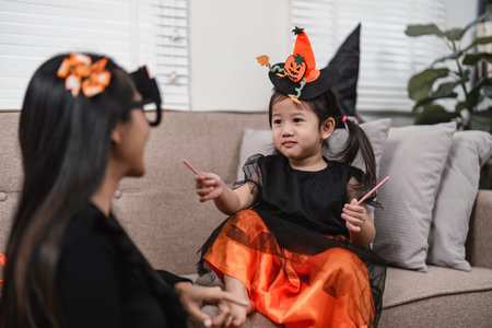 Halloween Celebration. Excited mother and daughter wearing festive hats, enjoying spooky fun.