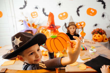 Cute boy in cowboy hat demonstrates his handmade paper pumpkin