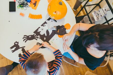 young mother with toddler son making craft spiders for halloween holiday