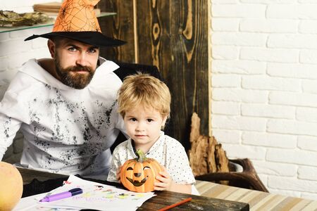 Girl and bearded man with interested faces on red spooky carnival room background. Dad and daughter with Halloween decor. Halloween party concept. Wizard and little witch in witch hats carve pumpkin