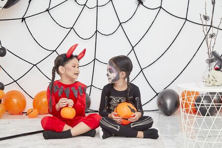 Two asian cute funny sisters celebrate the holiday. Jolly children in carnival costumes ready for Halloween
