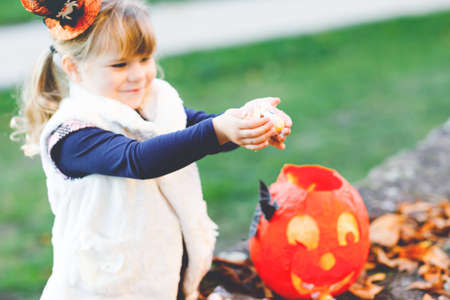 Little toddler girl dressed as a witch trick or treating on Halloween. Happy child outdoors, with orange funny hat and pumpkin bag for sweet haunt. Family festival season in october. Outdoor activity