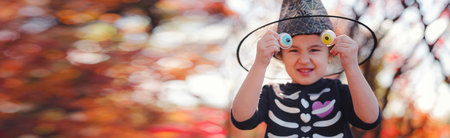 Child in Halloween costume. Asian girl kids trick or treat on street. Autumn holiday fun. copy space for text