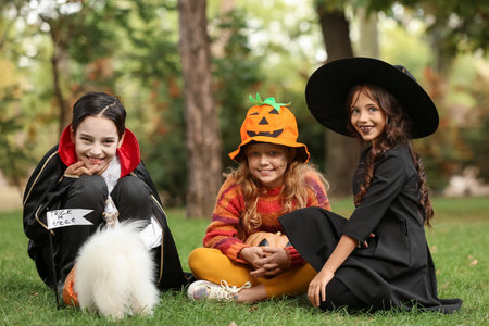 Cute little children in Halloween costumes outdoors