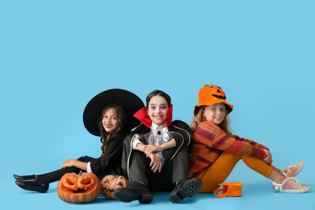 Adorable Little Children in Halloween Costumes.Cute Smiling Kids wearing Scary Halloween Costumes Sitting on Floor holding Orange Carved Pumpkin. Cute Girls Celebrating Halloween