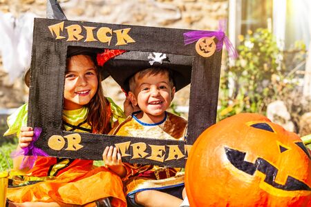 Two kids in trick or treat Halloween frame