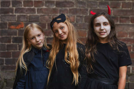 Waist up portrait of three girls dressed in Halloween costumes looking at camera while posing against brick wall outdoors