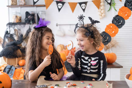 halloween holiday and childhood concept. Happy Family preparing for Halloween. two sisters taste decorated cookies at kitchen.
