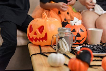 Festive halloween decorations are on a wooden table, including carved pumpkins, a ghost in a jar and spider web decorations as children prepare for trick or treat.