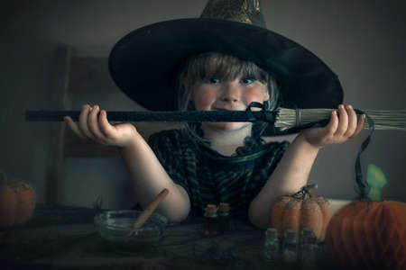 Cute little wizard playing with halloween pumpkins with lights on background